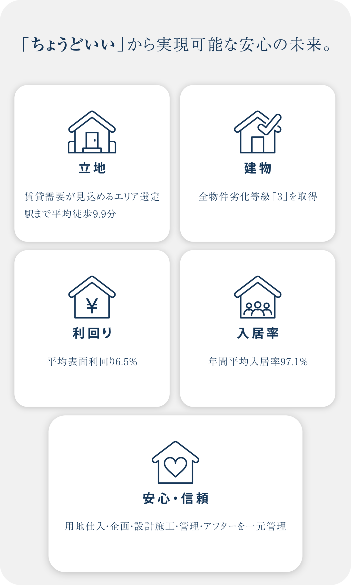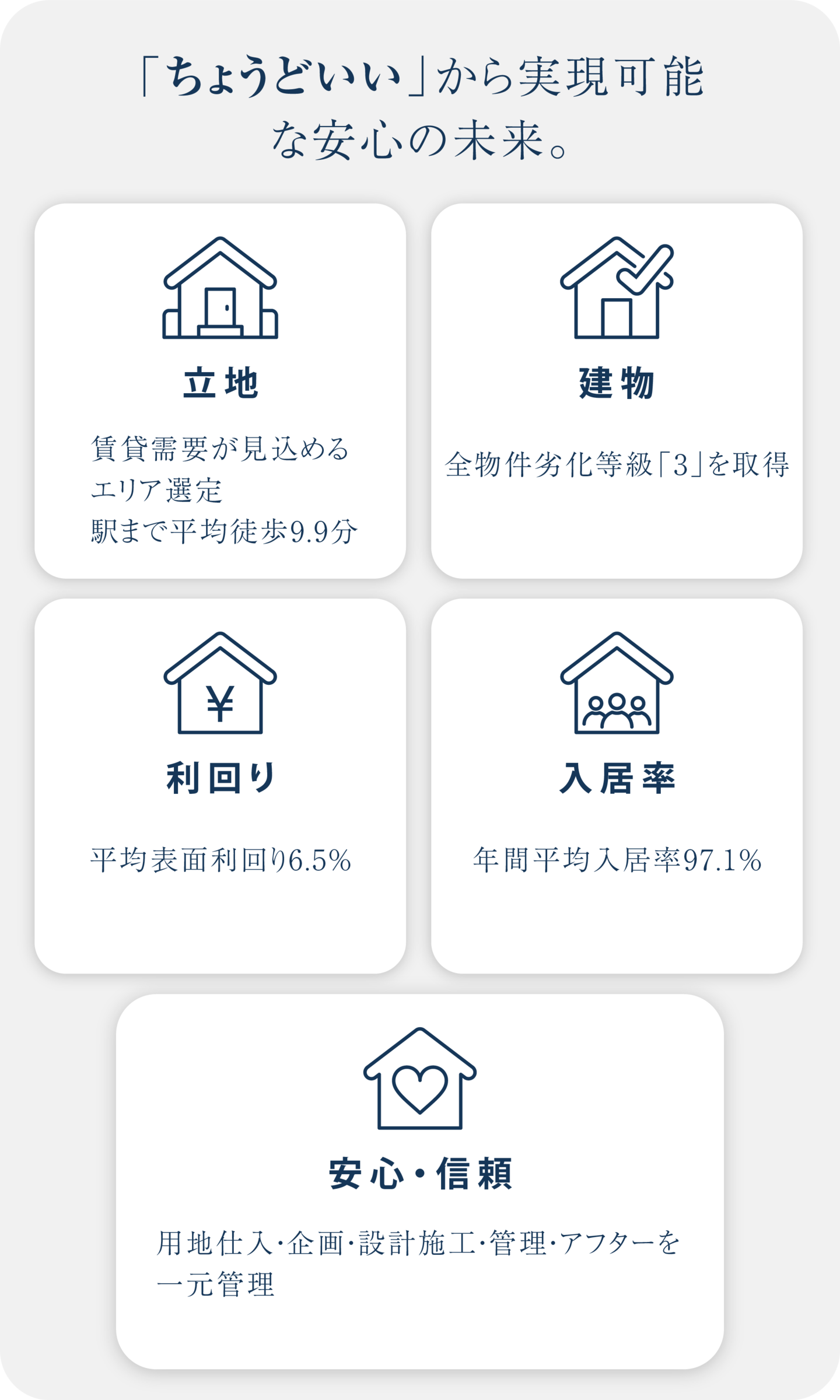 品質やサービスの向上はもちろん、中間コストをカットすることにより「低価格」「高品質」「高利回り」の物件をお客様にご提供することが可能です。物件をお引渡した後も、賃貸経営のスタートとしてオーナー様の収益物件の資産価値維持、安定した賃貸経営ができるようサポート致します。物件にまつわるご相談、リフォーム、相続までお気軽にお問い合わせください。
